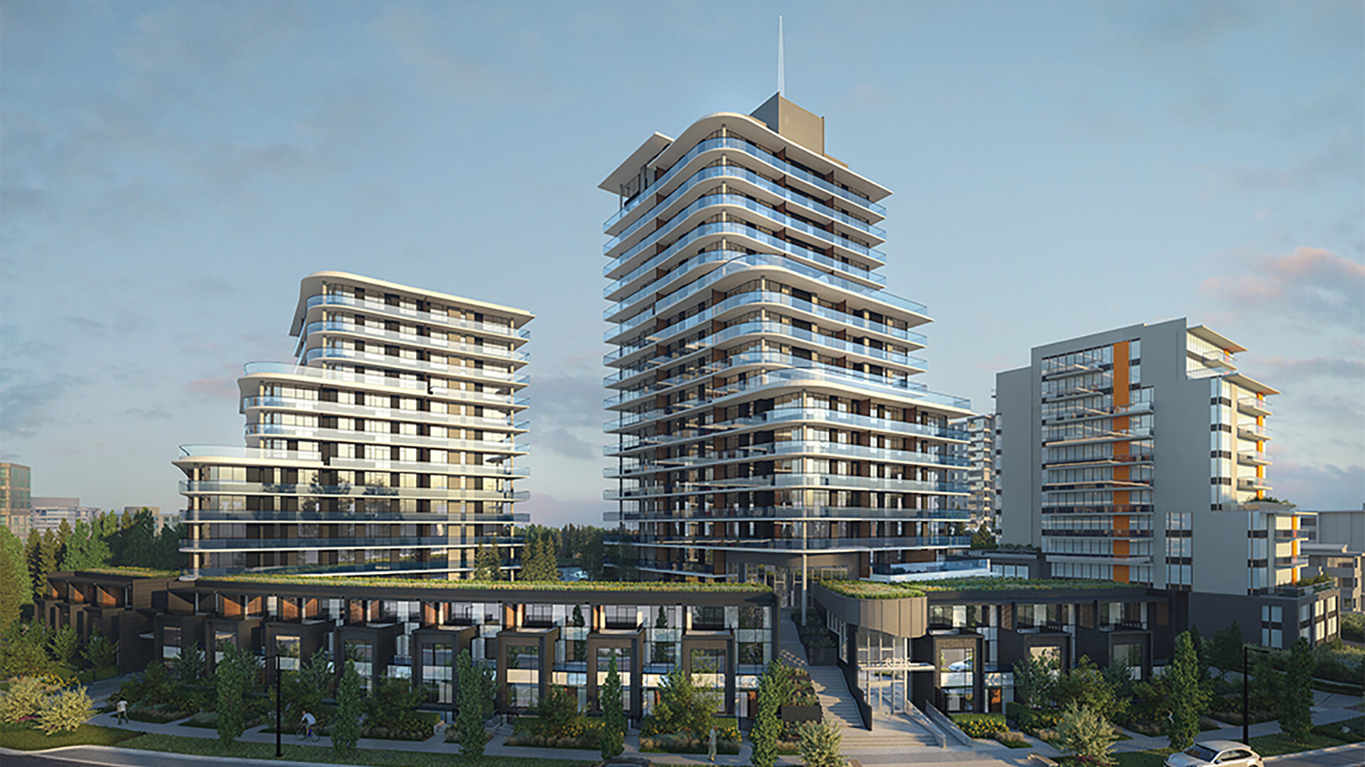 JRS was retained as the energy services consultant for Crescent Court, a residential development located at the peak of Burnaby Mountain in BC. The project is part of SFU’s UniverCity community and consists of two concrete residential towers, a 14-storey and a 20-storey high-rise, built over a three-storey townhouse podium. Additionally, the development features a path that leads up from University Crescent into the neighbouring Richard Bolton Park. The path provides pedestrian access to a richly landscaped courtyard with gathering spots, gardens, and a playground.